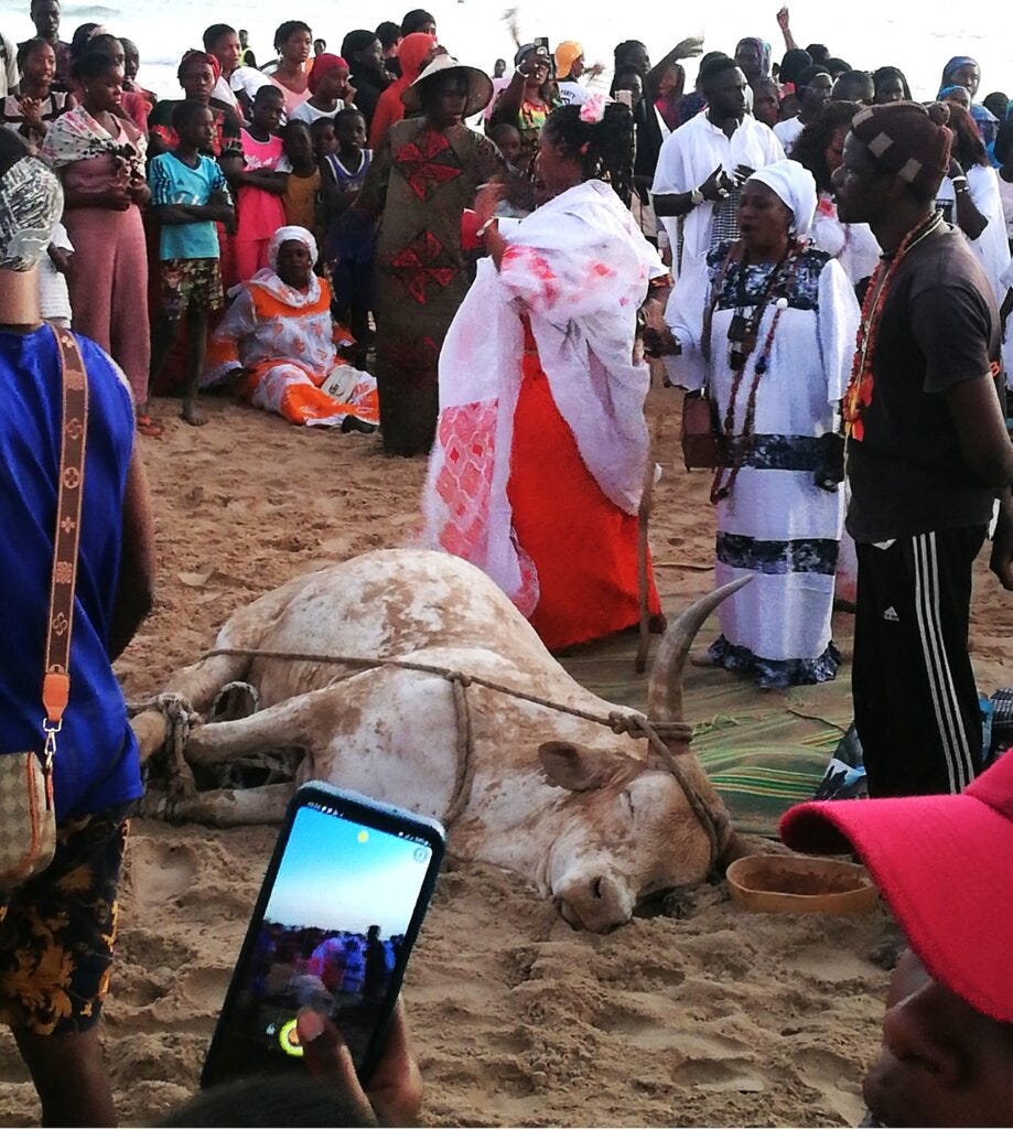 Then I notice a man in white who is being led into the circle by four women, who are also dressed in white. The man tries to fight. The four ‘angels’ force him to lie on the cow, and he obeys. Soon he is racked with convulsions. The dancing and drums continue, the ceremony master initiates a new song and the crowd follows. As soon as the cow has absorbed the disease, the sick man is then escorted out of the circle, away from the crowd, into the sea waves and submerged in water. His convulsions gradually subside. He is now weak. The four angels escort him out of sight. No one pays attention to him anymore. He has been healed, but it is forbidden to approach him this evening. People finish their song and leave the beach, walking away in the opposite direction. The cow, who absorbed the evil disease, will soon be killed.