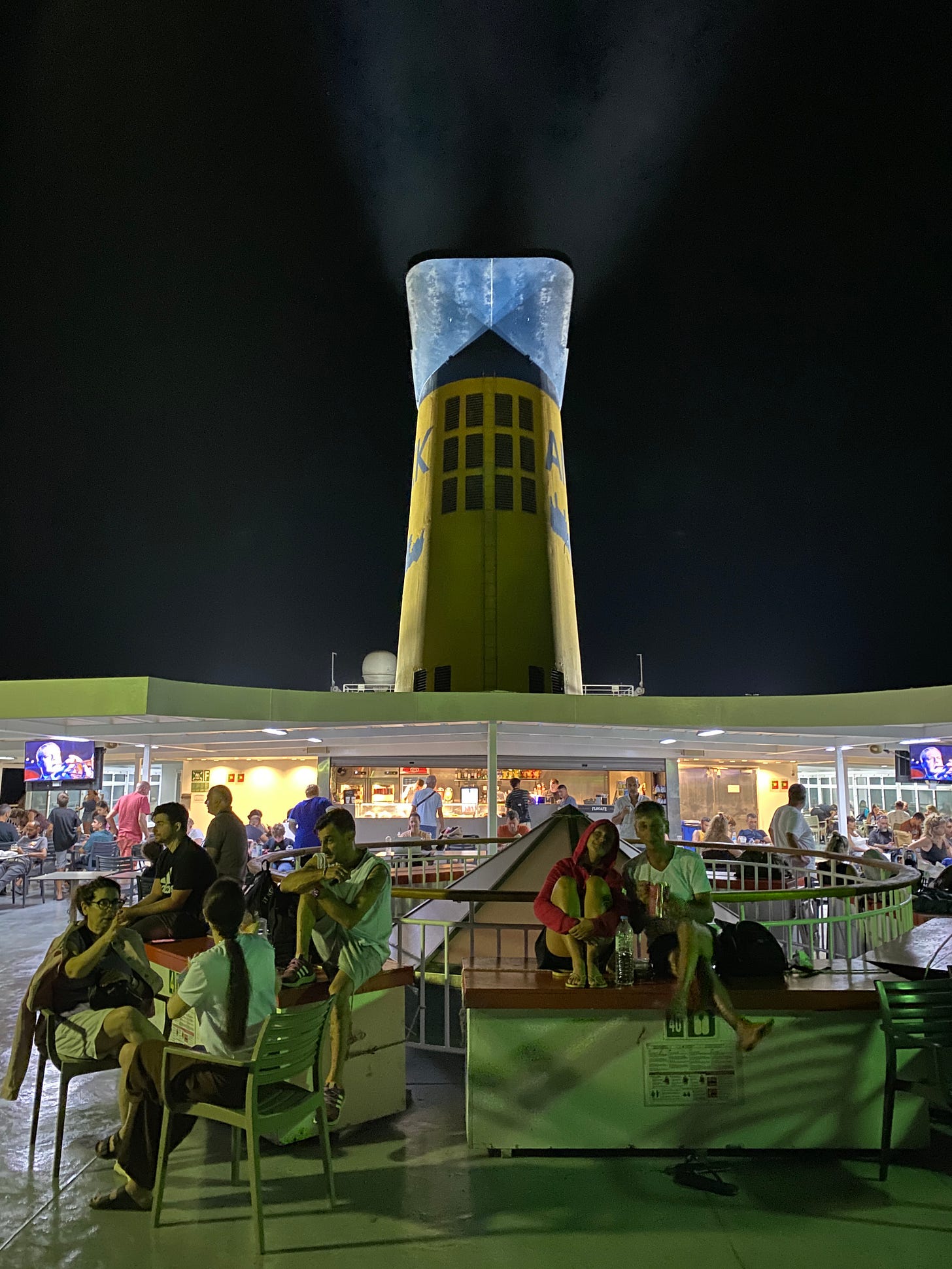 Soon I leave my mattress and gear with the Swedes and set out to explore the boat. The top deck is the most surprising, with people pitching tents. Some even have camping stoves. The night is warm and not too windy. The whole ferry feels like a festival.