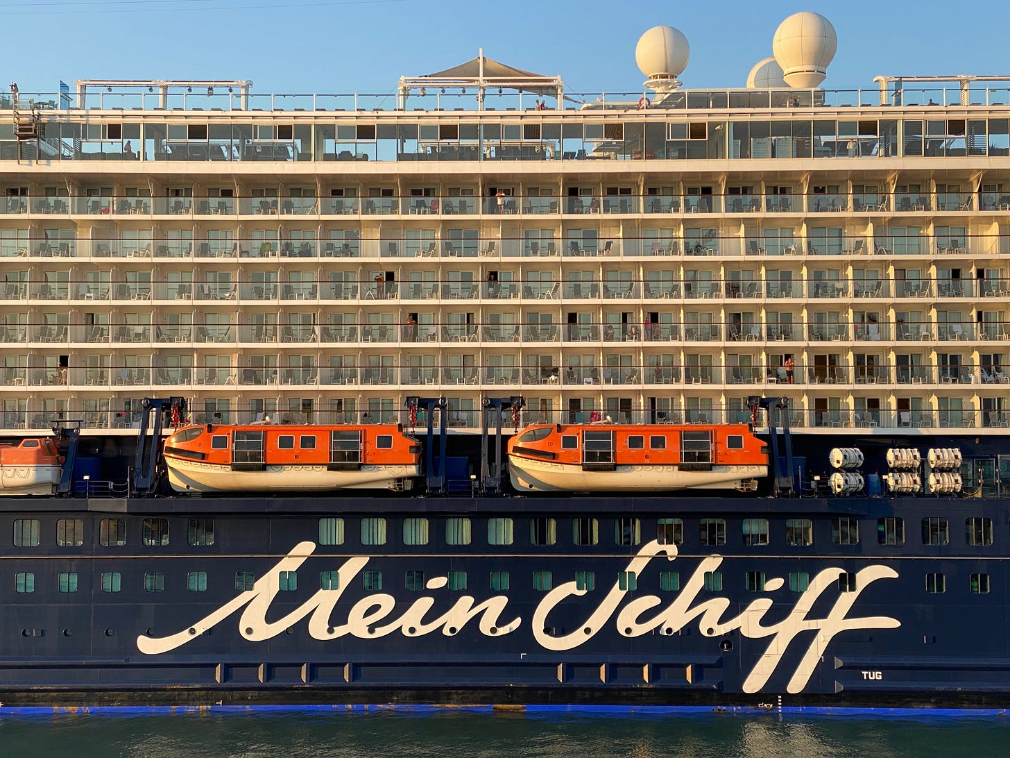 Examining the ten decks of a German cruiser, Mein Schiff, I notice passengers standing on private balconies, protected from the inconveniences and dangers of talking to strangers. Quite a contrast to our boat.