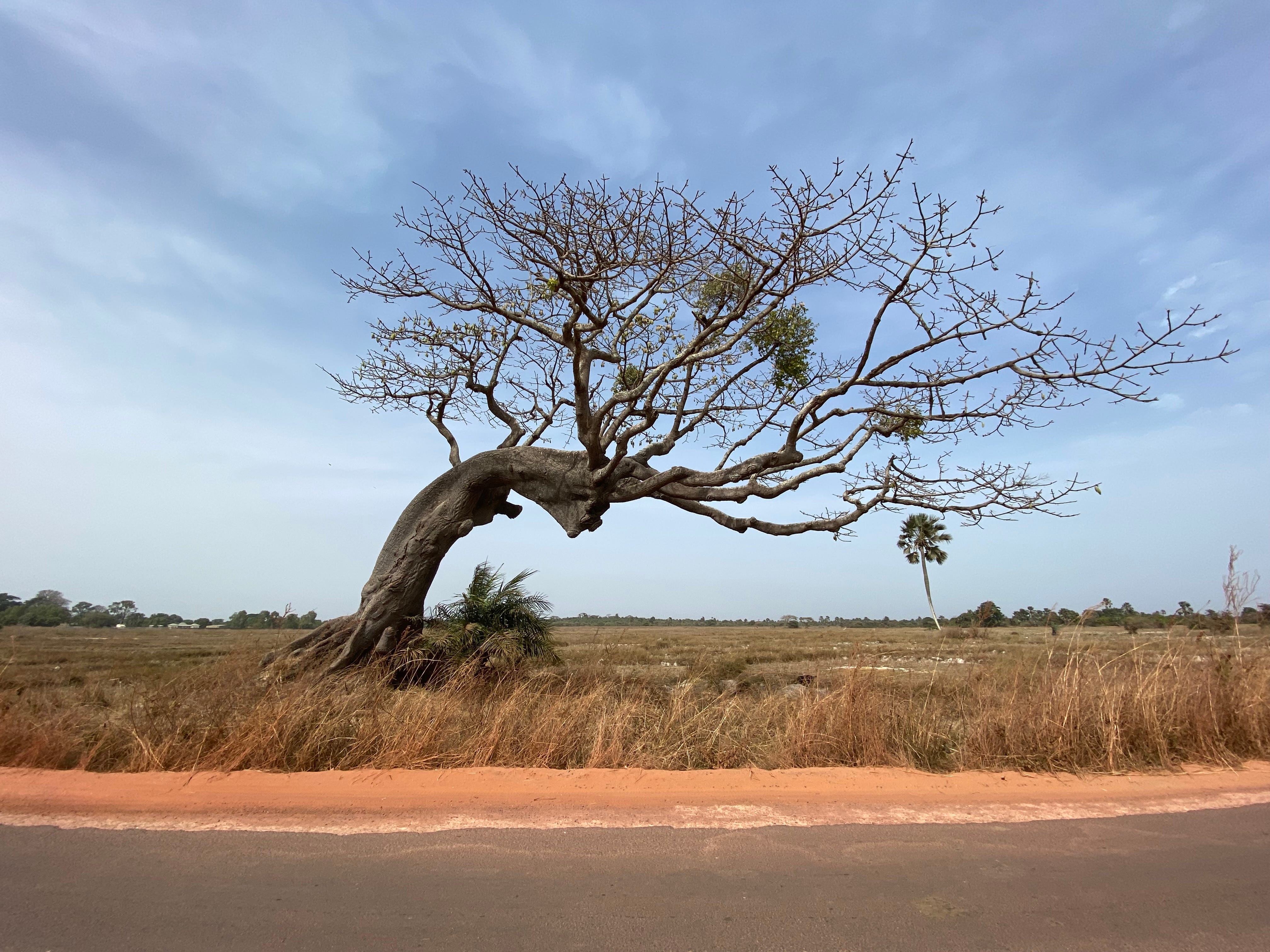 The road to Diembéring leads through tropical forest. At one point the forest opens, and among the fields stands a lonely tree of a fantastic shape. I asked the driver Omar about the tree and got this response: